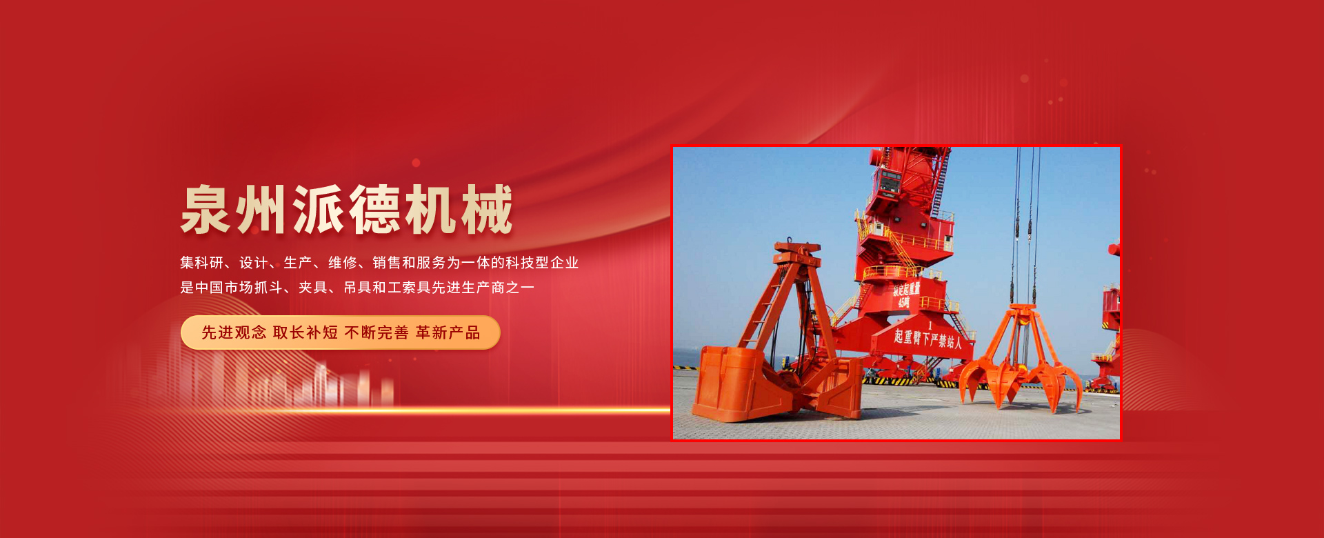 泉州派德機(jī)械有限公司成立于2012年5月,位于全國(guó)文明的古城福建泉州,公司擁有各類型專業(yè)員工82人,其中高級(jí)工程師1人,工程師4人,助理工程師5人,是一家集科研、設(shè)計(jì)、生產(chǎn)、維修、銷(xiāo)售和服務(wù)為一體的科技型企業(yè),是中國(guó)市場(chǎng)抓斗、夾具、吊具和工索具先進(jìn)生產(chǎn)商之一。產(chǎn)品采用國(guó)內(nèi)外先進(jìn)的設(shè)計(jì)方案、技術(shù)規(guī)范、制造過(guò)程、工藝流程和服務(wù),憑借在抓斗、夾具、吊具和工索具領(lǐng)域的超前設(shè)計(jì)理念和成熟的技術(shù)、工藝和管理,在抓具領(lǐng)域迅速崛起。